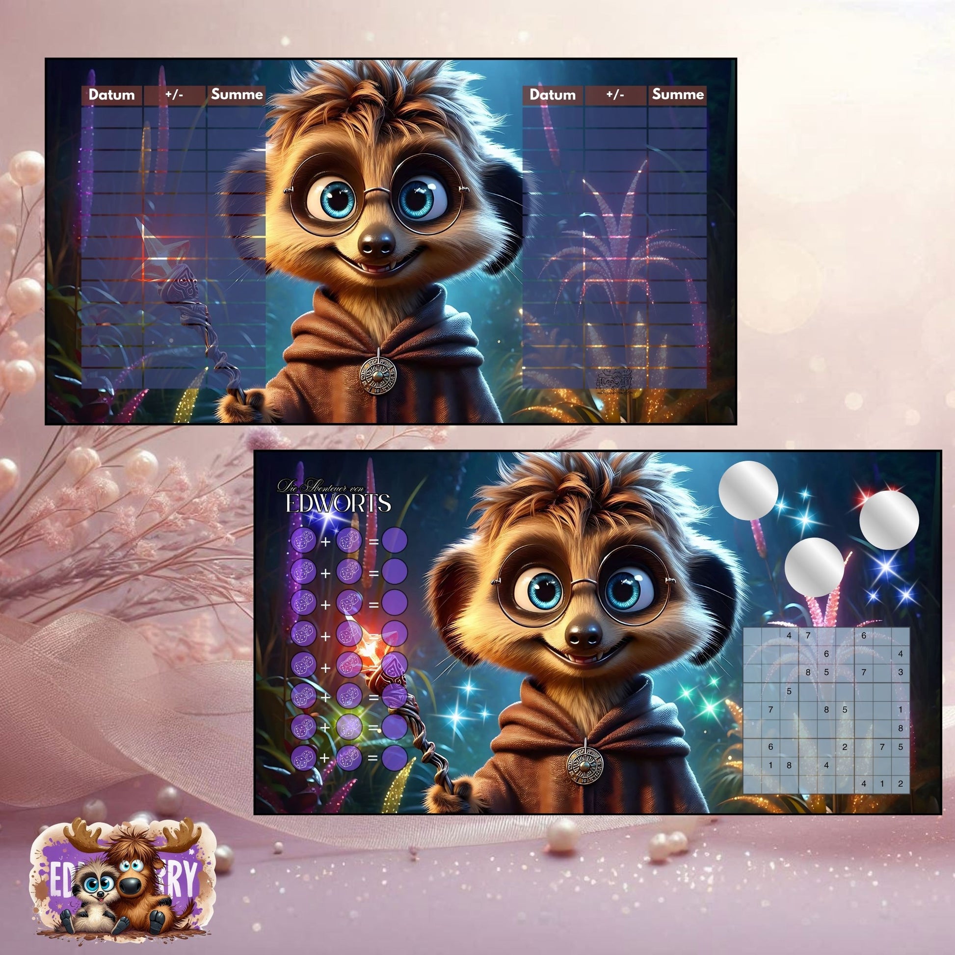 Tauche ein in die Welt von Edworts, dem charmanten kleinen Zauberer, der mit seinem Feuermagie-Zauberstab dein Sparziel in Flammen setzt – natürlich nur im positiven Sinne! Dieses Design lädt Kinder und Erwachsene dazu ein, auf spielerische Weise mit Würfeln und Logik Geld zu sparen.
