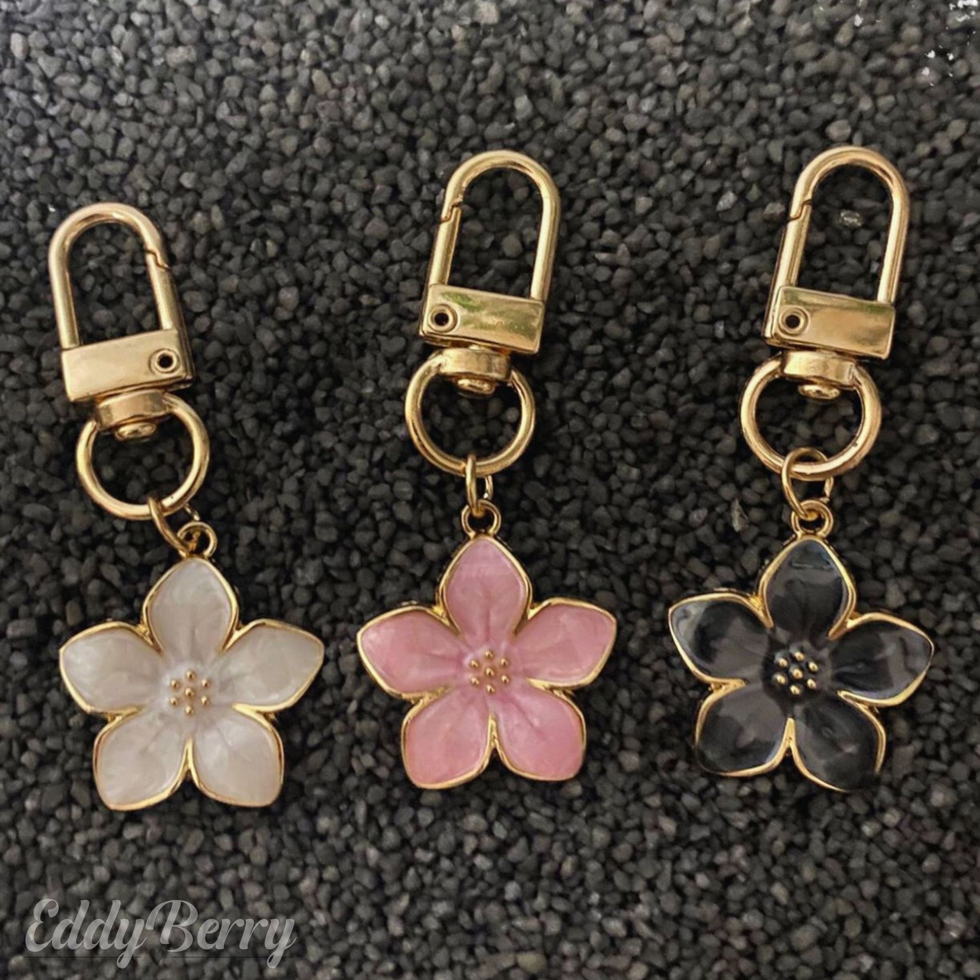 Diese eleganten Schlüsselanhänger in Blütenform sind in drei Farben erhältlich: Weiß, Rosa und Schwarz. Die Blütenanhänger sind mit einer goldenen Umrandung verziert, die ihnen einen luxuriösen Touch verleiht. Perfekt geeignet als stilvolles Accessoire für Schlüssel oder Taschen, bringen sie einen Hauch von Eleganz in den Alltag. Hochwertig verarbeitet und mit einem stabilen Karabiner ausgestattet, sind sie ideal für alle, die auf der Suche nach einem besonderen kleinen Schmuckstück sind.