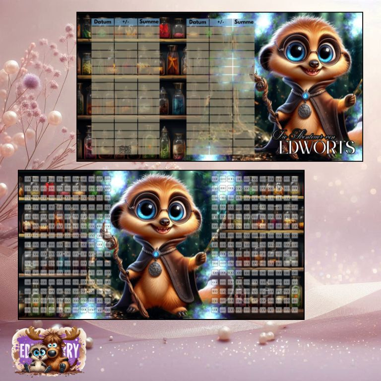 Sparen war noch nie so magisch! Mit der EDWORTS Spar-Challenge verwandelst du dein tägliches Kleingeld in ein echtes Abenteuer. Der süße Alchemist EDWORTS begleitet dich auf deiner Reise durchs Glasflaschen-Regal – jedes Feld steht für einen kleinen Sparbetrag.