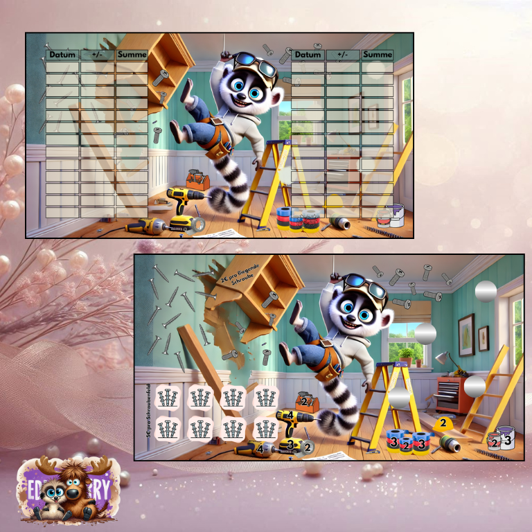 Das detailreiche Design mit Cash in seiner Chaos-Werkstatt bringt Humor in deine Sparroutine und zeigt dir: Auch wenn mal etwas „kaputtgeht“, kannst du es wieder in Ordnung bringen. 💪🐾