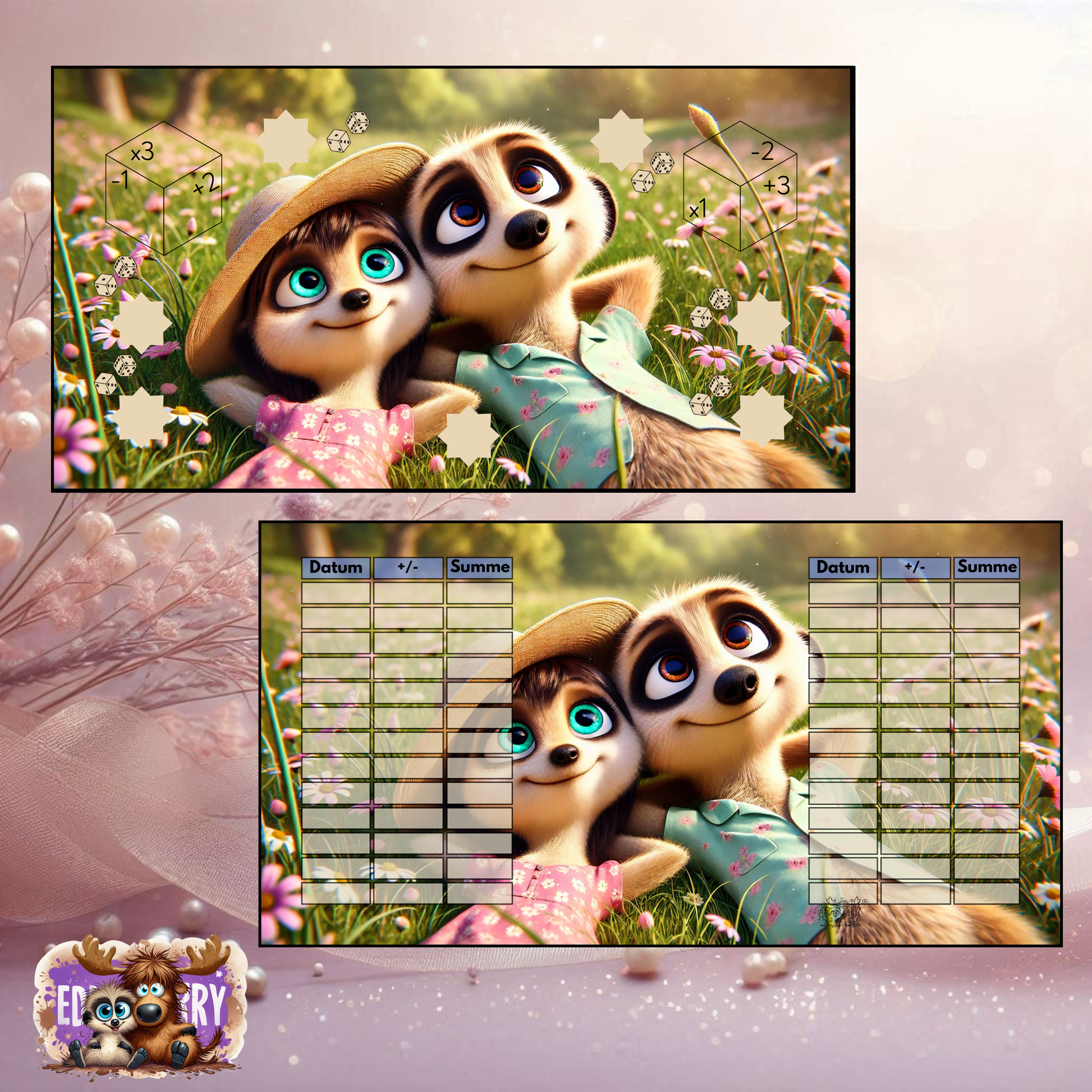 Im Mittelpunkt stehen Eddy & Cash, die entspannt im Blumenfeld liegen und daran erinnern, dass Sparen kein Druck sein muss. Die Plus- und Minus-Elemente bringen Abwechslung in jede Runde und machen jede Entscheidung ein kleines bisschen spannend – ohne Stress, ohne Zwang. 🌼🎲