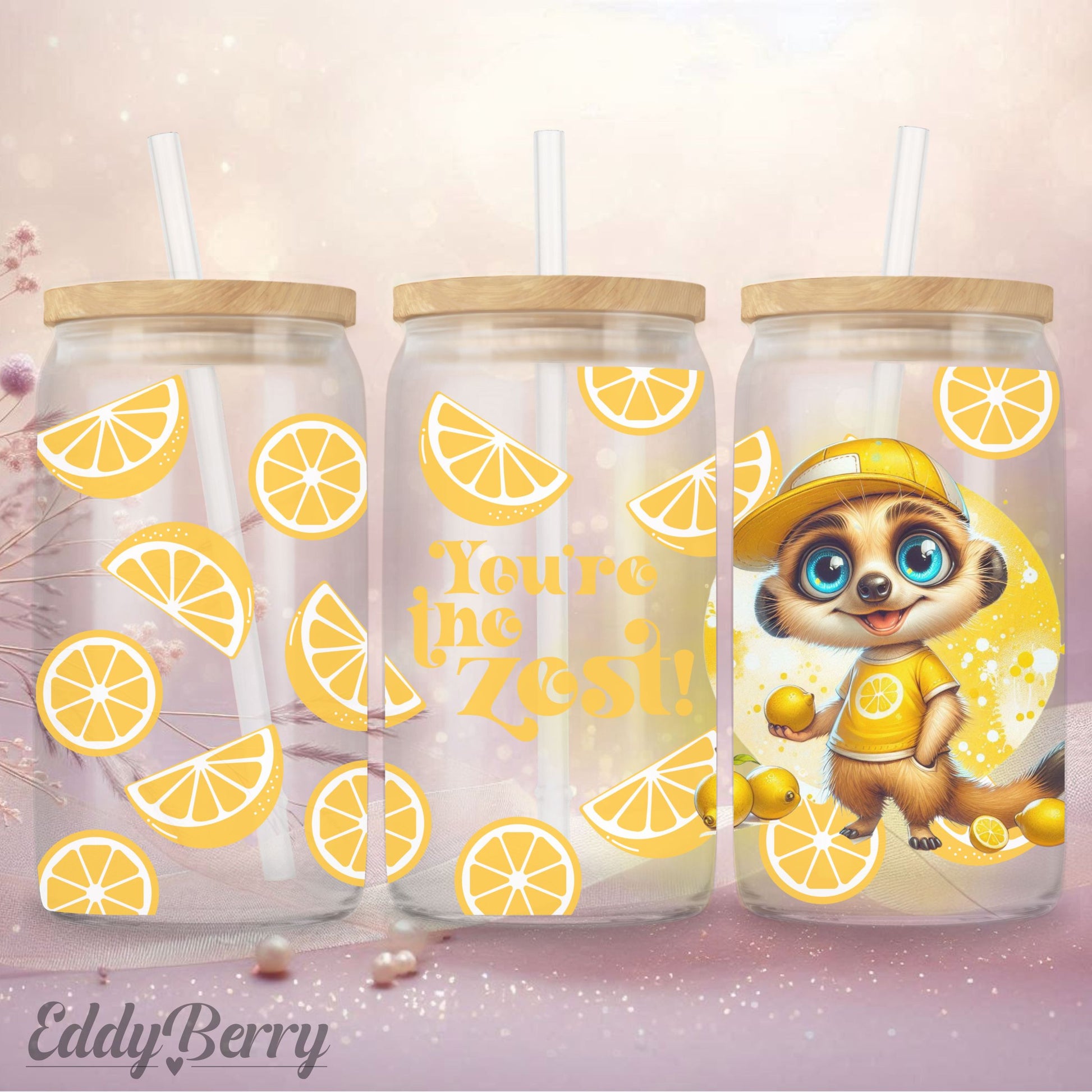 Sauer macht lustig – und dieser Becher macht einfach happy! Mit einem strahlenden Erdmännchen in Zitronen-Outfit, frischen Zitronenscheiben und dem Spruch „You’re the Zest!“ ist dieser Glasbecher ein echter Muntermacher. Perfekt für heiße Tage, kalte Drinks und gute Laune!