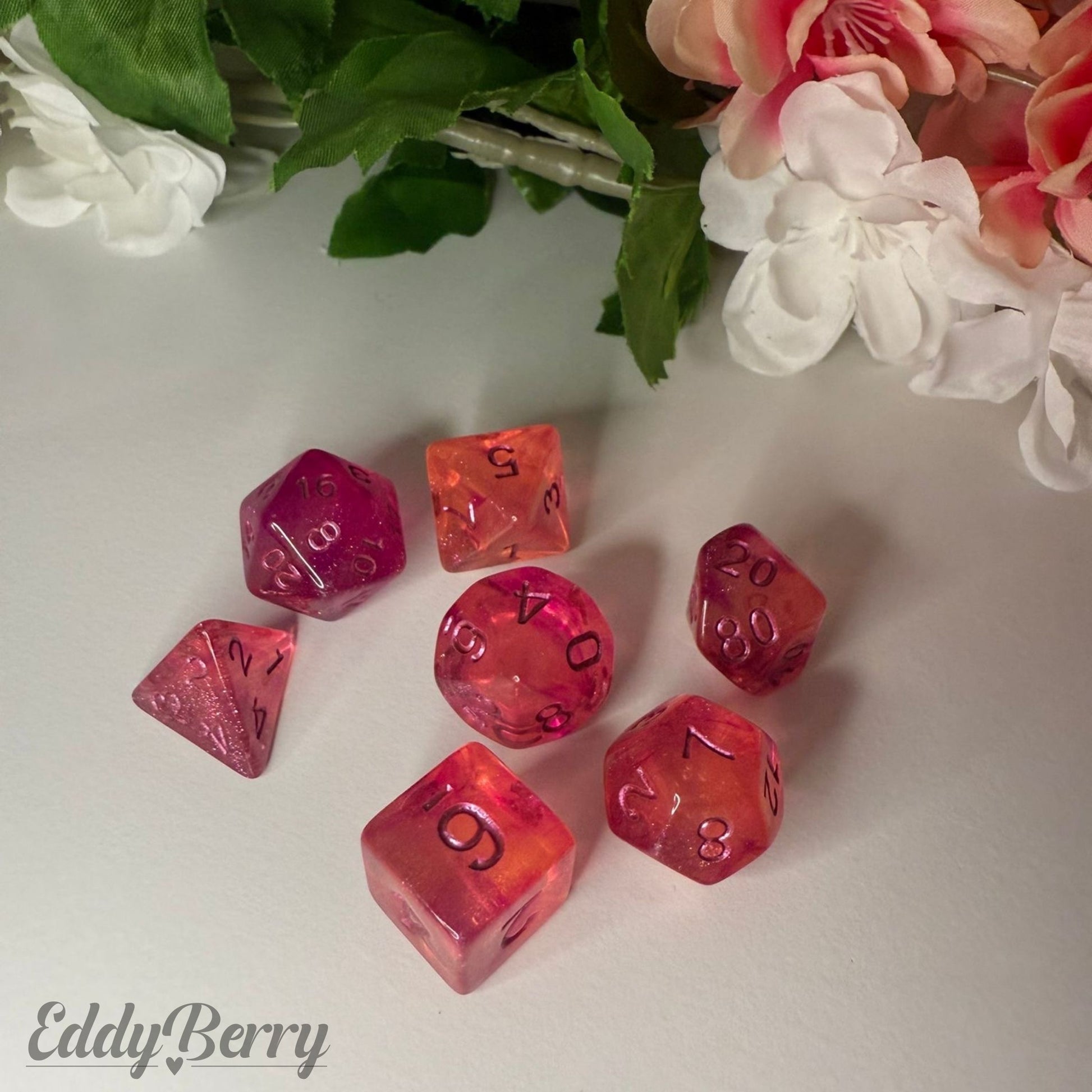 Mit dem 7-teiligen Würfelset Nebula Kiss bringst du die Magie einer farbenprächtigen Nebelwolke auf den Tisch. Violette und weiße Marmorierung, durchzogen von zarten Goldakzenten, lässt jedes Abenteuer traumhaft beginnen.